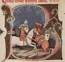 At that time the Pomeranians refused to pay their yearly tribute to the Duke of Poland, to whom they were subject. The Duke set out to exact by force of arms the tribute due to him from the Pomeranians. Then the Pomeranians, who were pagans, and the Poles, who were Christians, agreed together that their leaders should meet each other in a duel, and if the Pomeranian fell defeated, he would render the customary tribute; and if the Pole, then he might bewail its loss. Since [the] Duke [Mieszko] and his sons shrank in fear from the duel to be fought, [Béla] presented himself before them and through an interpreter spoke thus: "If it is pleasing to you, Poles, and to the lord Duke, although I am of nobler birth than that pagan, yet I will fight for the advantage of your kingdom and for the honour of the Duke." This was pleasing both to the Pomeranians and to the Poles. When they met in combat, armed with lances, [Béla] is said to have struck the Pomeranian so manfully that he unseated him from his horse; and the Pomeranian could not move from the spot where he had fallen, and [Béla] smote him with his sword. Then the Duke of the Pomeranians confessed himself at fault; and the Pomeranians, seeing this, humbly submitted to the Duke of Poland and paid the accustomed tribute without murmuring.