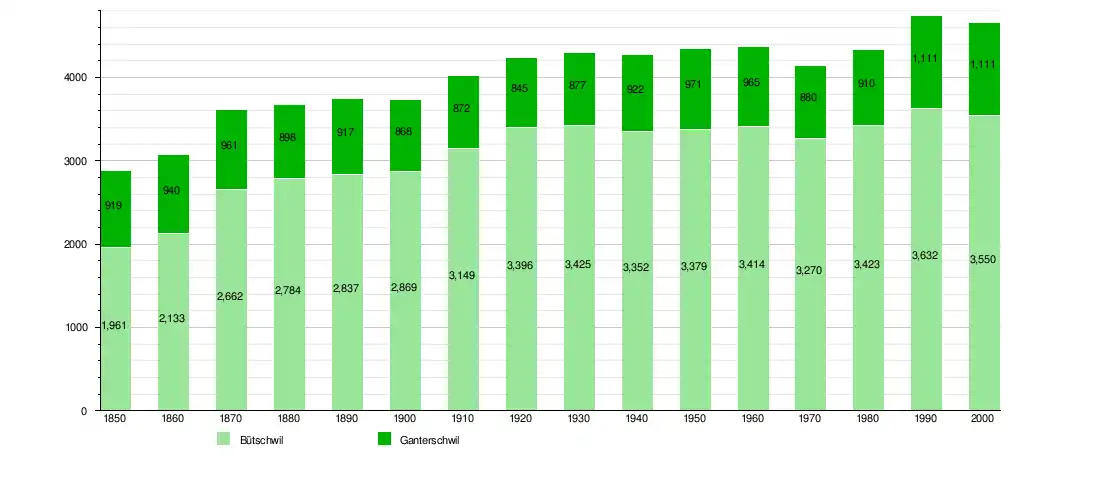 The total population of Bütschwil-Ganterschwil (as of December 2020) is 5,041.[8]
