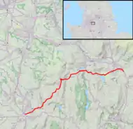 From the Highwayman the road descends through the village of Rainow, Cheshire, and then climbs the south edge of Kerridge Hill before beginning its final descent to Macclesfield, where it terminates at a junction with the A523.
