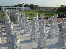 Construction commenced in 2002 with the celebration of the first carved stone-laying ceremony. The mandir was officially inaugurated on 25 July 2004 in the presence of Pramkuh Swami.[3] The mandir is composed of 33,000 pieces of marble and limestone that have been hand-carved in India by 2,400 artisans.[9] Shipped to Houston in 150 containers, the marble pieces were fitted together in tongue-and-groove fashion like a three-dimensional jigsaw puzzle. The entire structure, including the 4-foot foundation, does not contain a single piece of iron or steel.[11]