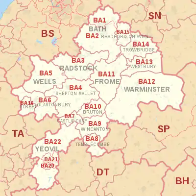 The BA postcode area, also known as the Bath postcode area,[2] is a group of nineteen postcode districts in South West England, within sixteen post towns. These cover east Somerset (including Bath, Yeovil, Bruton, Castle Cary, Frome, Glastonbury, Radstock, Shepton Mallet, Street, Templecombe, Wells and Wincanton) and west Wiltshire (including Bradford on Avon, Trowbridge, Warminster and Westbury), plus a very small part of north-west Dorset.