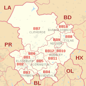 The BB postcode area, also known as the Blackburn postcode area,[2] is a group of thirteen postcode districts in north-west England, within nine post towns. These cover east Lancashire, including Blackburn, Burnley, Accrington, Barnoldswick, Clitheroe, Colne, Darwen, Nelson and Rossendale.