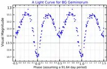 BG Geminorum is an eclipsing binary star system in the constellation Gemini. It consists of a K0 supergiant with a more massive but unseen companion. The companion is likely to be either a black hole or class B star. Material from the K0 star is being transferred to an accretion disk surrounding the unidentified object.[4]
