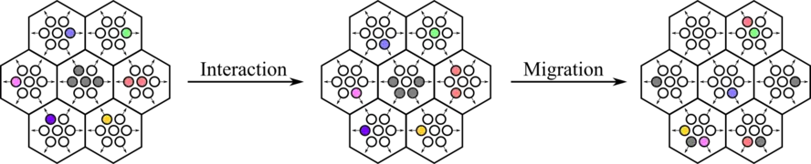 A new time step begins when both interaction and transport steps have occurred. Therefore, the dynamics of the BIO-LGCA can be summarized as the stochastic finite-difference microdynamical equation