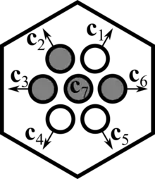 For modeling particle velocities explicitly, lattice sites are assumed to have a specific substructure. Each lattice site is connected to its neighboring lattice sites through vectors called "velocity channels", , , where the number of velocity channels is equal to the number of nearest neighbors, and thus depends on the lattice geometry ( for a one-dimensional lattice, for a two-dimensional hexagonal lattice, and so on). In two dimensions, velocity channels are defined as . Additionally, an arbitrary number of so-called "rest channels" may be defined, such that , . A channel is said to be occupied if there is a particle in the lattice site with a velocity equal to the velocity channel. The occupation of channel is indicated by the occupation number . Typically, particles are assumed to obey an exclusion principle, such that no more than one particle may occupy a single velocity channel at a lattice site simultaneously. In this case, occupation numbers are Boolean variables, i.e. , and thus, every site has a maximum carrying capacity . Since the collection of all channel occupation numbers defines the number of particles and their velocities in each lattice site, the vector describes the state of a lattice site, and the state space is given by .