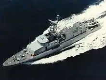 Originally armed with two Mk38 25 mm chain guns fore and aft, several pintle mounts for attaching .50 caliber machine guns or Mk 19 grenade launchers, and a position for launching Stinger shoulder-fired SAMs (although this was removed when the ship was transferred to the Philippine Navy and is currently unavailable), the ship, along with others of her class still in the US Navy, were upgraded early on by replacing the after Mk.38 mount with the new Mk.96 platform. The Mk.96 combines both a M242 Bushmaster 25 mm chain gun and a 40 mm automatic grenade launcher on a single stabilized platform. The Mk.96 features an electro-optical fire control system with 27x zoom, infrared and low-light modes, a laser rangefinder, and an array of environmental sensors, which feed data into the ballistics computer to produce an accurate firing solution even while maneuvering at high speed. The computer can also interface with Stinger SAMs (which are currently unavailable).[8] The US Navy was positive about the performance of the Mk.96 and briefly considered up-gunning the 25 mm Bushmaster cannon to a 30 mm or even 35 mm cannon, but due to the high price this never came to pass.