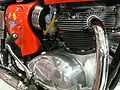 Two large-bore Amal GP carburetors with velocity stacks improved acceleration but made the Spitfire hard to kick start when the engine was hot, so owners chose to replace them with Amal Concentric carburetors with more conventional round air filters and this became the factory supplied specification in 1967. Keen to boost sales in the US market BSA produced a Spitfire with a two gallon fuel tank following the trend set by the Harley Davidson Sportster.