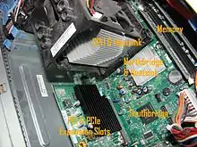 - Thermal design – The BTX layout establishes a straighter path of airflow with fewer obstacles, resulting in better overall cooling capabilities. There is no dedicated CPU fan – instead, a large 12 cm case fan is mounted, drawing its air directly from outside the computer and cooling the CPU through an airduct. Another distinct feature of BTX is the vertical mounting of the motherboard on the left-hand side. This results in the graphics card heatsink or fan facing upwards, rather than in the direction of the adjacent expansion card.