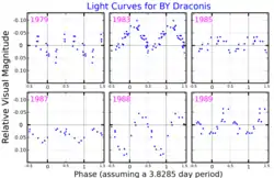 ![]() Visual band light curves for BY Draconis from six different years, adapted from Pettersen et al. (1992)[1] | |