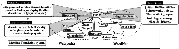 BabelNet is a multilingual lexicalized semantic network and ontology developed at the NLP group of the Sapienza University of Rome.[2] BabelNet was automatically created by linking Wikipedia to the most popular computational lexicon of the English language, WordNet. The integration is done using an automatic mapping and by filling in lexical gaps in resource-poor languages by using statistical machine translation. The result is an encyclopedic dictionary that provides concepts and named entities lexicalized in many languages and connected with large amounts of semantic relations. Additional lexicalizations and definitions are added by linking to free-license wordnets, OmegaWiki, the English Wiktionary, Wikidata, FrameNet, VerbNet and others. Similarly to WordNet, BabelNet groups words in different languages into sets of synonyms, called Babel synsets. For each Babel synset, BabelNet provides short definitions (called glosses) in many languages harvested from both WordNet and Wikipedia.