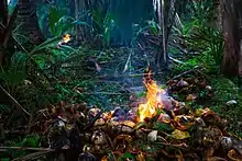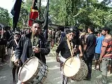 The most recent group of immigrants comes from neighbouring Afaloicai and arrived in Babulo in three successive waves. The oldest group from the Aldeias Buibela and Lena entered the Suco in the 1930s in the hope of finding land.[23] It is highly likely that these were refugees of the conflict over the fall of the Afaloicai empire. According to local records, Liurai Gregorio from Lena reached Babulo just before the arrival of the Japanese (1942, cf. Battle of Timor). He arrived in Babulo sounding fanfares, drums and flutes and set up camp on sacred land (rea luli) near Baha Liurai. Shortly thereafter a sickness spread among the newcomers, which can be traced back to this breach of taboo. So Gregorio asked the Daralari for permission to settle within their Suco. Marriage consolidated this newly formed alliance and Gregorio, the new son-in-law, was permitted to enter a place known as Tua Rae Laleo ("shelter of palm wine leaves"). He and his people received farming land in the vicinity of Uato-Lari Leten and Kampung Baru. .[24] As oa sae (giver of the bride) the family of Gregorio pledged to provide the Daralari with goods and services. But the Daralari point out that while Gregorio and his family merely have the rights to use the land, it is in fact still controlled by the "Lord of the Land".[25] After World War II the Portuguese pursued a policy of agricultural development in their colony. They ordered the village chiefs to organise teams to farm the land for the colonial government. As a result, a second wave of immigrants from Afaloicai and the area surrounding Mt. Matebian arrived in the Suco in the 1950s and 1960s, initially working as seasonal labourers on the rice fields constructed on the coastal plains of Uato-Lari. They too eventually settled permanently in the area. Many of them benefited from the family bonds they shared with those immigrants who had arrived and settled there earlier.[23][25] The third wave of immigrants was forcefully relocated to Babulo by the Indonesians after the resistance base on the slopes of the Matebian was destroyed in 1979, forcing many civilians to submit to the invaders. In contrast to Burmeta and Laka Roma these new immigrants are not familiar with, or embedded in, traditional community structures. Instead they continue their own distinct hierarchies and clans.[23] They are still frequently perceived as temporary co-inhabitants by the native population, as well as labelled "people using the land for agricultural and gardening purposes" at ceremonies and rituals.[24]