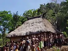 Nowadays, the land of the Daralari is shared among its five most powerful houses. Rivers, hills and rocks mark the boundaries. These territories are not interconnected, but mirror the traditional shifting land cultivation. Access to these territories is passed on from the founding ancestors to their direct descendants. In order to continue using the land, members of the houses have to keep their ritualistic and communal duties up. Otherwise, they risk provoking the wrath of the ancestors, which may bring misfortune, sickness or even death.[15] By "passing over into the dark" the Daralari transferred the task of land cultivation as well as watching over natural resources (lai bosa, lai wai) to a subordinate house (um kain) of Daralari, the Uma kabo. At a later date, a Kabo Rai, a primary representative of the Uma kabo, asked the Bu Dato for a symbol of his power. In response, a Makaer Luli, an expert in rituals, was placed at his side. In addition to supervising land and water usage, the Kabo Rai also enforces seasonal harvesting restrictions on certain products, exacts tributes for community ceremonies, and imposes penalties for ignoring the rules. When implementing these tasks, he is assisted by representatives of two other subordinate houses of the Daralari: Asu Rati Reino and Asu Rati Liurai. The Makaer Luli accompanies the tasks spiritually. Not only is he the leader in community rituals, but also an intermediary capable of communicating with the spiritual realm, as well as a guardian of sacred relics kept in the sacred house, the Uma luli of Borolalo.[8] This is the place where the ancestors are said to have settled first after their arrival from the sea.[16]