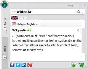 A single click on any text using the right mouse button or combination of the right mouse button and a keyboard modifier, and the Babylon window appears providing a translation and definition of the clicked term.[23] Babylon is a tool used for translation and conversion of currencies, measurements and time, and for obtaining other contextual information. Babylon has a patented OCR technology and a single-click activation that works in any Microsoft Windows application, such as Microsoft Word, Microsoft Outlook, Microsoft Excel, Internet Explorer and Adobe Reader. When activated, Babylon opens a small popup window that displays the translation or definition. To solve the incompatibility problem of Babylon OCR browsers extension; users can benefit from Capture2Text free app version 3.9 (only 3.9v) which is compatible with Babylon 8 or another version. While dragging its capture box in any text from any browsers then a pop-up box appears and Babylon could easily grasp it. Babylon provides full text translation, full Web page and full document translation in many languages and supports integration with Microsoft Office. Babylon enables the translation of Microsoft Word documents and plain text files. It offers results from a database of over 1,700 sources in over 75 languages.[24]