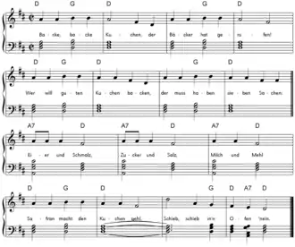 "Backe, backe Kuchen" is a popular German-language children's rhyme. The original was in Saxony and Thuringia with several textual versions from 1840.