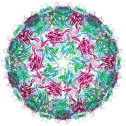 | Bacteriophage MS2 capsid structure. The three quasi-equivalent conformers are labelled blue (chain a), green (chain b) and magenta (chain c) | |