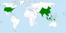 Endemic to Southeast Asia, B. dorsalis is a highly invasive pest species that now has a presence in at least 65 countries. It has also been introduced to Hawaii, the Mariana Islands, and Tahiti. The fly is also found in most countries of sub-Saharan Africa.[9] From 1910 to 1990, the fly species was only observed in 5 countries; however, in the last three decades, the rate of spread by B. dorsalis has sharply increased, with the species invading an additional 70 countries.[10]