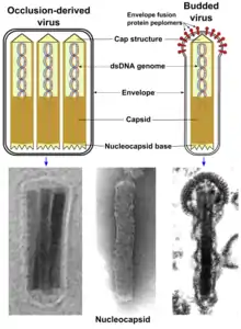 The baculovirus lifecycle involves two distinct forms of virus. Occlusion-derived virus (ODV) is present in a protein matrix (polyhedrin or granulin) and is responsible for the primary infection of the host. while the budded virus (BV) is released from the infected host cells later during the secondary infection.