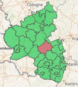 Bad Kreuznach is a district in Rhineland-Palatinate, Germany. It is bounded by (from the north and clockwise) the districts of Rhein-Hunsrück, Mainz-Bingen, Alzey-Worms, Donnersbergkreis, Kusel and Birkenfeld.