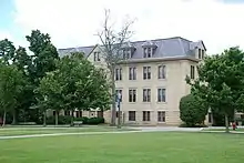 Badin Hall is one of the 32 Residence Halls on the campus of the University of Notre Dame and one of the 14 female dorms. The smallest residence hall on campus, it is located on South Quad, between Howard Hall and the Coleman-Morse center. It was built in 1897 and hosted the Manual Labor School until 1917 before being converted into a men's dorm.[3][4][5][2][6][7][8] During World War II, it was part of the United States Naval Reserve Midshipmen's School, and in 1972 it became one of the first two residence halls at Notre Dame to host women.[9][10][11]