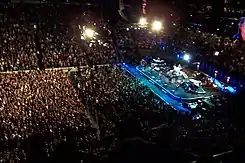As evidenced by its appearance on three live offerings, "Badlands" has been a staple of Springsteen and E Street Band concert performances. Indeed, it is Springsteen's fourth most played song in concert besides "Born to Run", "Thunder Road" and "The Promised Land".[6] It opened shows on the 1978 Darkness Tour before the album had even been released, a slot it held for much of that tour (one such performance from Arizona Veterans Memorial Coliseum was filmed and released as a promotional video in the early 1980s). It was featured near or at the end of the first set during the 1980–1981 River Tour (one such performance from Arizona State University, famously introduced by Springsteen decrying the election of Ronald Reagan as president the night before, was included on Live 1975–85, less the intro), a spot it held for much of the 1984–1985 Born in the U.S.A. Tour until the stadium shows, when it was used to keep momentum going out of the opening "Born in the U.S.A.". "Badlands" was put on the shelf for most of the 1988 Tunnel of Love Express, a mark of how radically that tour sought to throw out stock show elements. Once the 1992–1993 "Other Band" Tour was underway, it was quickly added back in for some needed mid-first-set energy. Springsteen seemed to conclude it fit this role, as he kept it in the same "10 songs in" position during all of the 1999–2000 Reunion Tour and 2002–2003 Rising Tour shows, recapturing audience enthusiasm after less familiar material such as "Murder, Inc." or "Worlds Apart" were performed. On the 2007 Magic Tour, however, the shortened show time resulted in "Badlands" becoming even more prominent as the main set closer. For the 2009 Working on a Dream Tour, "Badlands" resumed its old role as the show opener; it stayed in that slot until the final two months of the tour—when Springsteen chose to play the Born to Run album in its entirety at a show, "Badlands" was usually shifted to be the final song of the main set, which the track "Born to Run" had previously held on the tour.