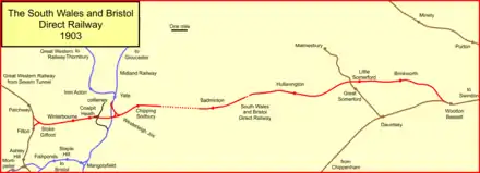The original Parliamentary Bill for the line proposed a branch to the Severn and Wye Joint Railway, which would have run more or less parallel with the Bristol and Gloucester line of the Midland Railway. The proposal was withdrawn by arrangement with the Midland Railway, and it was agreed that a short spur connection could be made at Yate and another south of Berkeley Road, to connect it with the joint railway, and exercise their old running powers from 1846 and 1848 over the intervening 11 miles (18 km) of the Midland line. The two spurs referred to opened for goods traffic on 9 March 1908.[19][3]