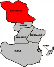 Bagamoyo is one of the six districts of the Pwani Region of Tanzania. It is bordered to the north by the Tanga Region, to the west by the Morogoro Region, to the east by the Indian Ocean and to the south by the Kibaha District. The district capital is at Bagamoyo.