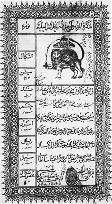 Soon after declaring his spiritual mission to Mullá Husayn,[lower-alpha 5] the Báb sent him to Tehran to deliver a special tablet[lower-alpha 6] to one whom God would guide him to. After learning about Baháʼu'lláh through an acquaintance, Mullá Husayn felt compelled to arrange for Baháʼu'lláh to receive the tablet—this news brought great joy to the Báb when Mullá Husayn wrote him about it.[24] Bahá’u’lláh received the tablet when he was 27, he immediately acknowledged the truth of the Báb’s message and arose to share it with others.[19] In his native province of Núr Bahá’u’lláh’s notability as a prominent local provided numerous opportunities to teach the Bábí Faith, and his trips attracted many to the new religion, including Muslim clerics.[25] His Tehran home became a center for activities, and he generously gave financial support for the religion.[26] In the summer of 1848, Bahá’u’lláh attended and hosted[27] a gathering at Badasht in the province of Khorasan, where 84[28] Bábí disciples met for 22 days. At that conference historic discussions took place between those who wanted to maintain Islamic law (the religious heritage of most early Bábís[lower-alpha 7]) and those who believed the Báb had inaugurated a new religious dispensation. Baháʼu'lláh influenced agreement around the latter point of view.[34] It was at Badasht that Mírzá Ḥusayn-ʻAlí Núrí assumed the name Bahá’[35] and also gave new spiritual names to all other attendees; thereafter the Báb addressed tablets to them by those names.[36][lower-alpha 8] When Táhirih, the most prominent female disciple of the Báb, was arrested after the conference, Baháʼu'lláh intervened to protect her. Subsequently he himself was temporarily confined and punished with bastinado.[37]