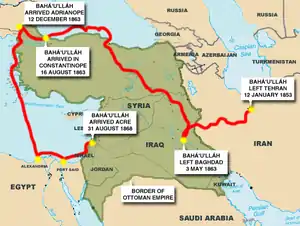 When it was proven beyond any doubt that Baháʼu'lláh was absolutely innocent of involvement with the attempt against the Shah’s life,[48] the king finally agreed to free him but decreed Baháʼu'lláh would be forever banished from Iran.[53] Dispossessed of his extensive properties and wealth, in the exceptionally severe winter of January 1853 Baháʼu'lláh with family members undertook a three-month journey to Baghdad, thus beginning what became exile for the rest of his life in territories of the Ottoman Empire.[54][55]