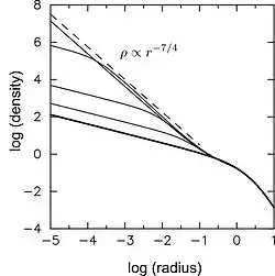- The term "cusp" refers to the fact that a graph of density vs. radius has a cuspy appearance if plotted on linear axes, rather than the logarithmic axes used in the figure.
