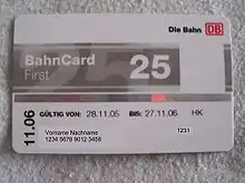 BahnCard (German Bahn – Rail) is a discount subscription programme offered by Deutsche Bahn (DB), the German national railway company. Unlike airline loyalty programs, but similarly to the UK Railcard, the BahnCard entitles the passenger to a discount price and must be purchased prior to travel. The BahnCard is offered in a non-business and a business version called BahnCard Business. Non-business BahnCard contracts are automatically renewed each year, unless they are cancelled with sufficient notice. Three variants of BahnCard are sold by Deutsche Bahn: The BahnCard 25, the BahnCard 50, and the Mobility BahnCard 100. The first two variants allow passengers to get 25% and 50% discount respectively on standard long-distance rail fares, while the Mobility BahnCard 100 is a type of annual ticket that allows free unlimited travel on most of the German railway network for a fixed price.[1] The (non-business) BahnCard 25/50 are valid for one year and can only be purchased by subscription. If they are not canceled no later than six weeks before the expiry date, their term is automatically extended by another year.[1] BahnCard Business 25/50 are also valid for one year but require no cancellation.[2] In contrast to the personal BahnCard, BahnCard Business can be combined with the discount that is granted to large-volume business customers.[3][2]