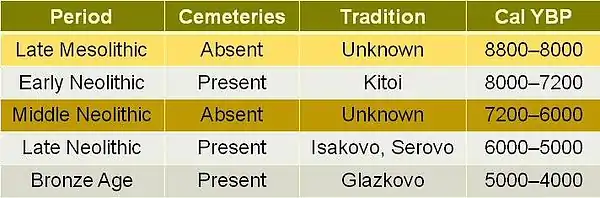 The first period of social complexity is associated with the Early Neolithic Kitoi culture, while the second period relates to the Late Neolithic and Bronze Age Isakovo, Serovo, and Glazkovo cultures, respectively. Since most of the current knowledge about the region’s Middle Holocene prehistory has been derived from examination of cemeteries, the Middle Neolithic, which lacks mortuary sites, does not enjoy the same level of archaeological identity as the preceding and following periods. Thus, it has often been referred to as the period of hiatus or discontinuity in the use of formal cemeteries.