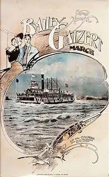 During the Lewis and Clark Exposition of 1905, Bailey Gatzert made two excursions a day to Cascades Locks, in the Columbia Gorge, departing Portland at 8:30 a.m. and at 5:30 p.m., with a fare of $1.50, including meals served on board.[3] A special tune was written for the steamer at this time, the "Bailey Gatzert March".[3]
