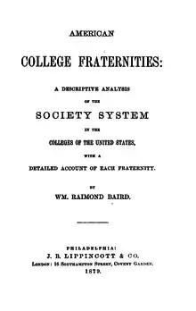 The reference work was compiled by William Raimond Baird (1848-1917), an 1878 graduate of the Stevens Institute of Technology. He exhaustively researched other fraternal organizations when he was seeking a suitable partner to merge with his own Alpha Sigma Chi.[1] He eventually selected Beta Theta Pi, which absorbed ΑΣΧ in 1879. As no authoritative resource on the subject existed, Baird published his research for the benefit of the public as American College Fraternities. Baird would go on to publish eight editions of the reference. He died in 1917.