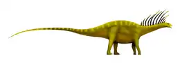 Bajadasaurus is classified as a member of the Dicraeosauridae, a family of sauropod dinosaurs. As with all sauropods, dicraeosaurids were large, four-legged herbivores with a long neck and tail and a relatively tiny head. They were small compared to most other sauropods, reaching roughly the size of present-day Asian elephants, and their neck was comparatively short.[5][6] Long bifurcated (two-pronged) neural spines were a common feature of the group, although they were only extremely elongated in Bajadasaurus and the closely related Amargasaurus.[3]