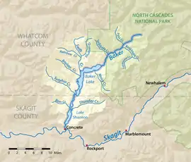The Baker River is an approximately 30-mile (48 km),[1] southward-flowing tributary of the Skagit River in northwestern Washington in the United States. It drains an area of the high North Cascades in the watershed of Puget Sound north of Seattle, and east of Mount Baker. With a watershed of approximately 270 square miles (700 km2) in a complex of deep valleys partially inside North Cascades National Park, it is the last major tributary of the Skagit before the larger river reaches its mouth on Skagit Bay. The river flows through Concrete, Washington, near its mouth and has two hydroelectric dams owned by Puget Sound Energy.