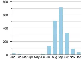 The source of the Bakoy is at an elevation of 760 m in the granite Monts Ménien to the northwest of Siguiri in Guinea. The river flows north and forms part of the international border between Guinea and Mali. It then meanders across the Manding Plateau and joins its principal affluent, the Baloué, which rises to the west of Bamako.[4] The Bakoy is 560 km in length[5] and drains a basin of around 85,600 km2. The river is seasonal with a maximum flow in September after the start of the West African Monsoon and almost no flow between January and June.[1] The large year-to-year variation in the intensity of the West African Monsoon gives rise to large changes in the discharge of the Bakoy River. For the exceptionally dry year of 1972, the average flow at the Oualia gauging station, 54 km upstream of Bafoulabé, was only 30 m3/s while in 1958 the value was 260 m3/s. The average flow over the period 1951-1978 was 156 m3/s corresponding to an annual discharge of 4.9 km3.[1] At Bafoulabé the average discharge of the Bakoy is between a third and a half of that of the Bafing.[6]