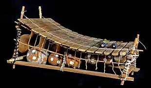 The balafon (['bæləfɔ̃],[1] [bɑlɑ'fɔ̃];[2] Bambara: ߓߟߊ bala[3]) is a gourd-resonated xylophone, a type of struck idiophone.[4] It is closely associated with the neighbouring Mandé, Senoufo and Gur peoples of West Africa,[4][5] particularly the Guinean branch of the Mandinka ethnic group,[6] but is now found across West Africa from Guinea to Mali.[5] Its common name, balafon, is likely a European coinage combining its Mandinka name bala with the word fôn 'to speak'[5][7] or the Greek root phono.[4]