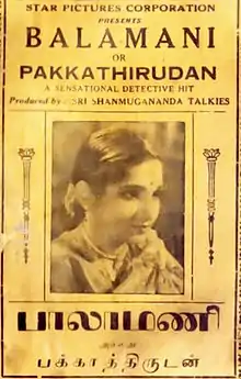 Balamani is a 1937 Indian Tamil-language film directed by P. V. Rao and produced by Shanmughananda Talkies. It is based on the two-volume novel of the same name, alternatively titled Pakka Thirudan by Ayyangar. The film stars T. K. Shanmugham, T. S. Jaya, T. K. Muthusami, B. Saradambal, T. K. Bhagavathi, K. Shanthadevi and S. V. Sahasranamam.[1]