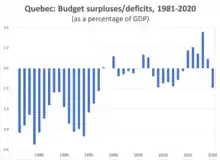 The Government of Quebec adopted the Balanced Budget Act (BBA) in 1996. The BBA prohibits a budget deficit, other than in special circumstances.[1][2]