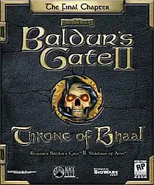 Baldur's Gate II: Throne of Bhaal is an expansion pack for the role-playing video game Baldur's Gate II: Shadows of Amn.[1][2][3] It adds a multi-level dungeon called Watcher's Keep to the game[3] and completes the main plot.[1] There are several new weapons, a higher level cap, a further refined Infinity graphics engine, and new class-related features and magical skills.[2][3] The novelization of the game was written by Drew Karpyshyn and released in September 2001.[4]