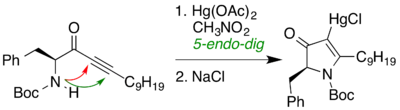 A 5-endo-dig ring closing reaction was part of a synthesis of (+)-Preussin:[8]