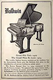 The Baldwin Piano Company is an American piano brand. It was once the largest US-based manufacturer of keyboard instruments and known by the slogan, "America's Favorite Piano". It ceased most domestic production in December 2008, moving its total production to China. A subsidiary of Gibson Brands, Inc.,[3] current pianos only display the "Baldwin" name and brand with all of the formerly American made upright models being made in Baldwin's Chinese factory.[4][5]