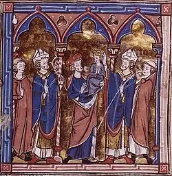 After the question of regency was settled, Baldwin V and Raymond received homage as king and regent, respectively. The young king then took part in a solemn crown-wearing ceremony in the Church of the Holy Sepulchre at his uncle's command.[13] From there the boy was carried to banquet on the shoulders of Balian of Ibelin, stepfather of Baldwin IV and Sibylla's half-sister, Isabella, thus signifying that the succession arrangement had the support of the potential contender's family.[14] Baldwin IV had died by 16 May 1185, leaving Baldwin V as the sole king.[15]