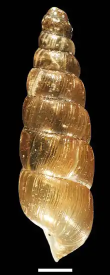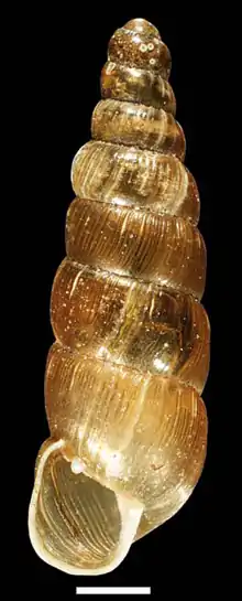 The shell is small and resembles that of a juvenile clausilid. The color is pale brownish and the surface is often silky shiny. The shell often has distinct riblets. The apical whorls are cylindrical. The shell has 8-9 whorls and (unlike many clausiliids) the last whorl has the largest diameter. It is densely ribbed. The cervix is almost without keel. Apart from a rudimentary parietal fold, there are no folds in the aperture. This species has no clausilium.[3]