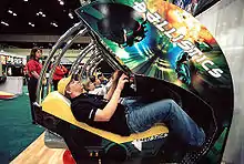 Grin announced in May 2001 that it was working on an arcade version of Ballistics for distribution by Triotech.[12] The game's gameplay had to be reworked to suit an arcade environment, and support was added for multiplayer games with up to eight linked cabinets. Triotech designed a unique reclined seating cabinet for the game, the aim of the design was to offer the player a more comfortable and immersive experience. The inspiration for the design came to Triotech co-founder, Ernest Yale; who whilst putting his feet up on the desk, realised how comfortable the playing position was. Ballistics was released for arcades in January 2002.[13]