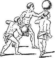 Balloon, baloun, balloon-ball or wind-ball is a game similar to the modern game of volleyball, in which a leather ball is batted by the fist or forearm to prevent it from touching the ground. The game was played in ancient Rome where it was known as follis, the Latin word for a leather bag. Such a ball made of leather was quite heavy and so protection might be used such as a leather gauntlet or wooden bracer.[1] The Roman game was considered a sport for boys and old men, as Martial wrote:[2]