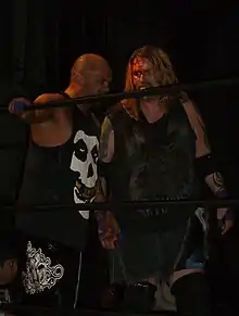 Mahoney's first singles match at a pay-per-view was a victory over Steve Corino at Living Dangerously.[17] Shortly after, Mahoney formed a tag team with Spike Dudley. At Hardcore Heaven, the two faced the Dudleyz in a championship match but failed to win the title.[18] The two teams faced in a rematch at Heat Wave, and this time, Mahoney and Dudley won the match and the World Tag Team Championship, marking Mahoney's second individual reign.[4][15][19] At a show in August, the duo re-lost the title to the Dudleyz.[20]
