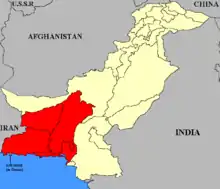 The Baluchistan States Union or Balochistan States Union (BSU) was an administrative division of Pakistan that existed between 3 October 1952 and 14 October 1955 in the southwestern part of West Pakistan. It was formed by the four princely states of Kalat, Kharan, Las Bela and Makran with the capital at the town of Kalat.[1] The area of the Union was roughly the south-western half of the modern province of Balochistan. The Union was separate from the Chief Commissioners Province of Baluchistan which comprised areas to the northeast of the Union. The Union did not include the enclave of Gwadar which was part of the Muscat and Oman. The four state rulers continued in office and retained autonomy.[2]
