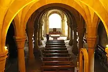 Construction of this first cathedral had begun in 1002, with work starting on two crypts. It was consecrated on Heinrich's birthday, on 6 May 1012. This first cathedral was a cruciform basilica with the main choir in the west and a second to the east, each above a crypt. Two towers were located on the eastern façade. The nave was covered by a flat wooden ceiling. This cathedral was smaller than the current structure (only around 75 m long). This cathedral burned down in the Easter week of 1081. Whilst the interior art was completely destroyed, damage to the structure was relatively minor. It was quickly rebuilt - by 1087 it was possible to hold a synode here.[1]: 204 Bishop Otto had the church rebuilt completely and it was reconsecrated in 1111.[2][3]: 5