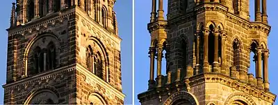The current structure is a late Romanesque building with four big towers. The eastern towers were originally lower, but raised to the western towers' height after 1766 by steep pointed gables, added by architect Johann Jacob Michael Küchel.[1]: 204 The western towers are early Gothic.